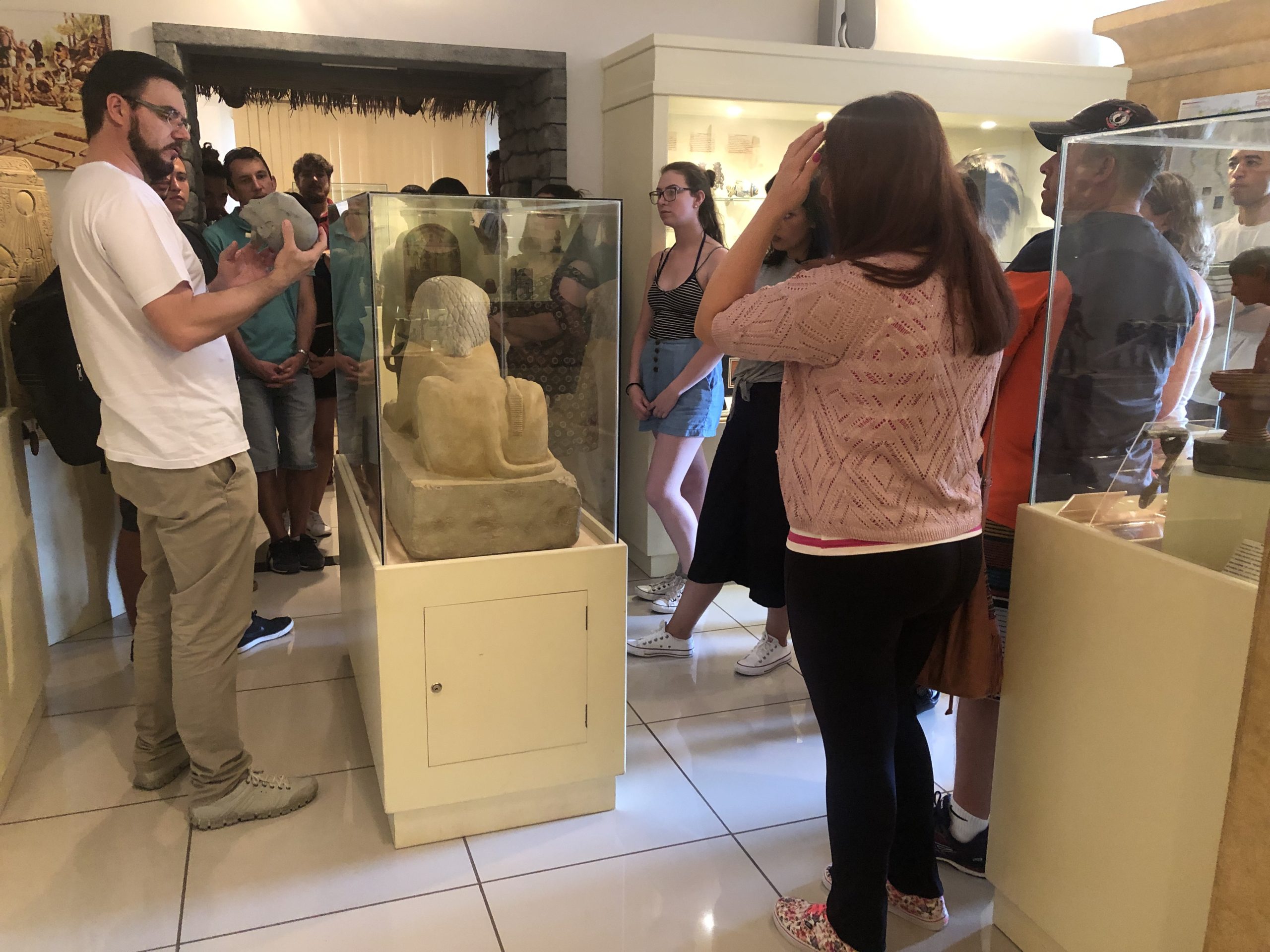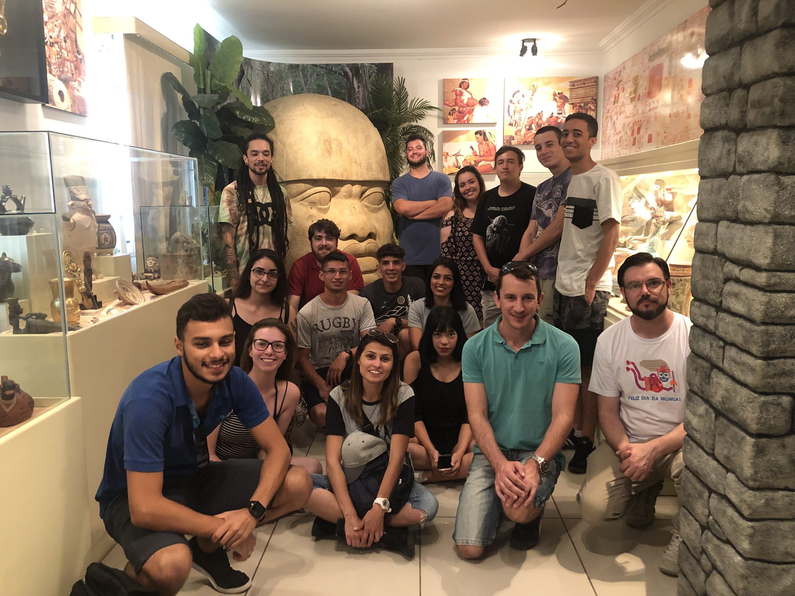 A primeira parada dessa aula de campo foi no Museu de Arqueologia Ciro Flamarion Cardoso, que foi criado e atualmente é mantido pelo professor Dr. Moacir Elias Santos, responsável pelas disciplinas de História Antiga e Arqueologia do Curso de História. Lá, os alunos puderam ver e obter informações a respeito de objetos produzidos pela sociedade egípcia e sobre as culturas pré-colombianas das sociedades que habitaram a América antes da chegada dos europeus.
