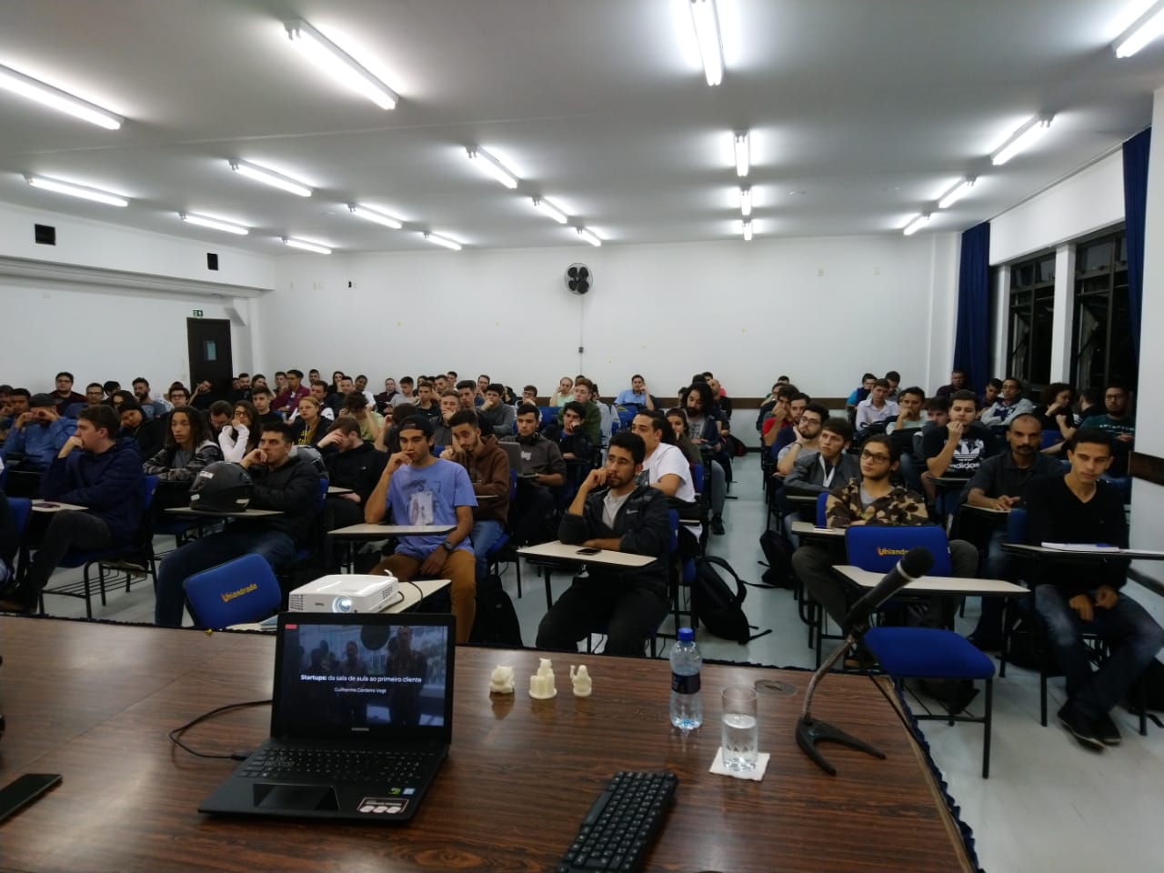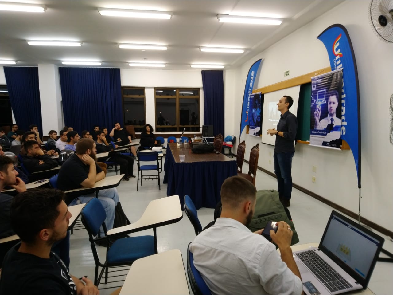 Para esta noite foi abordado o tema StartUp: da sala de aula ao primeiro cliente pelo palestrante Guilherme Vogt, aluno de engenharia elétrica da Universidade Federal do Paraná (UFPR), que explanou as oportunidades e ações realizadas durante a sua vida acadêmica.